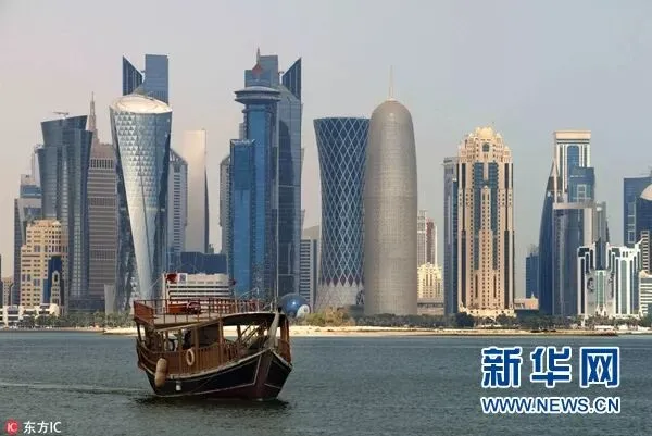 卡塔尔首都多哈,一艘卡塔尔传统单桅帆船,背后是多哈金融区的天际线摩天大楼。新华网发(图片来源:东方IC)