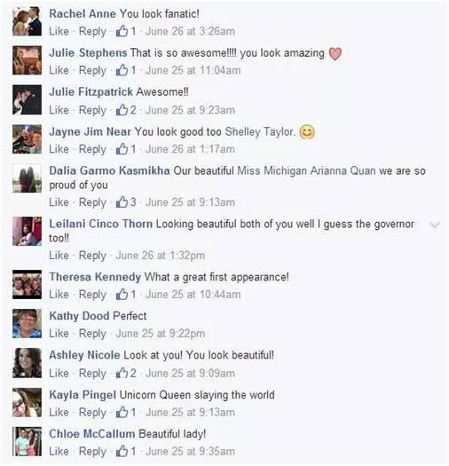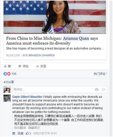 根据维基百科显示,密歇根州只有100万人口,其中白人亚裔只占其总人口数的2.4%。作为华裔,能在白人比例高达80%的密歇根州当选选美皇后的人是实属不易。