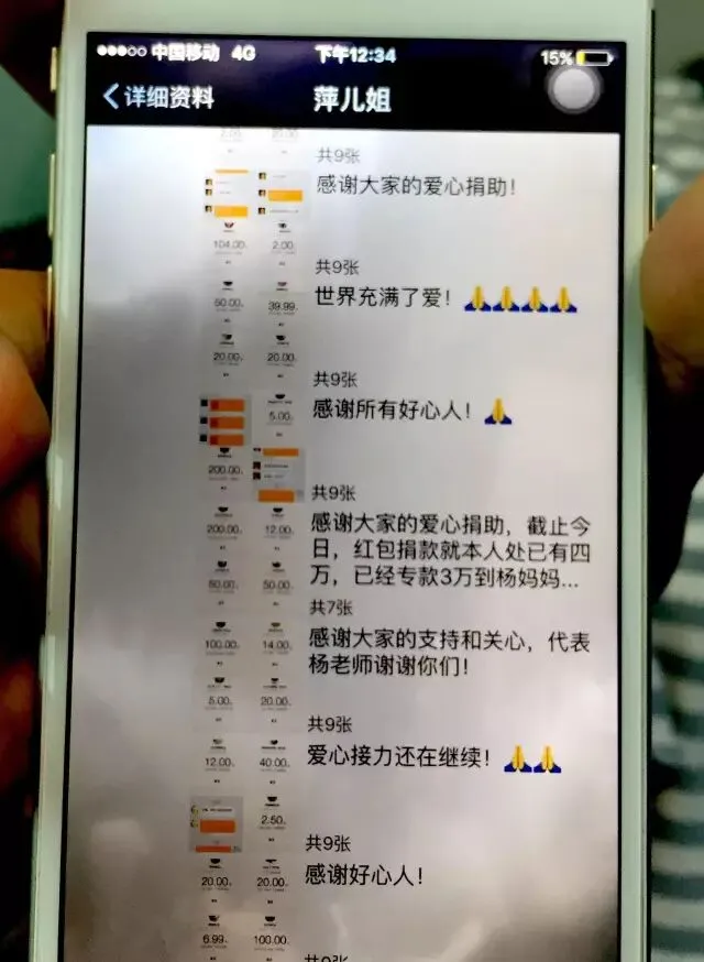 从6月15日开始,“萍儿姐”的朋友圈几乎完全为了自己的闺蜜在“刷屏”,发布爱心募捐,公布爱心人士截图,公示爱心款项的账目,转发网上众筹的链接,“哭谢”包括歌手蒲巴甲在内众多爱心捐款者的帮助…“萍儿姐”为自己好姐妹在此间发了近300条微信。