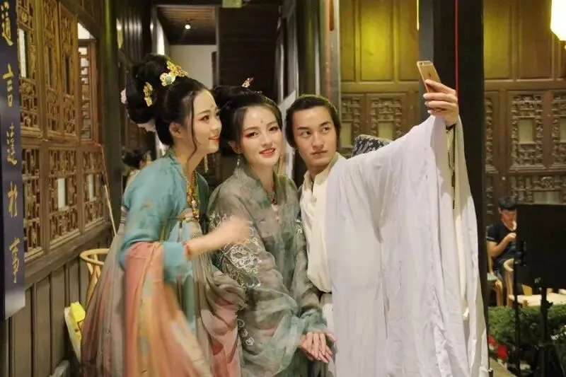 ▲市民与汉服美女合影