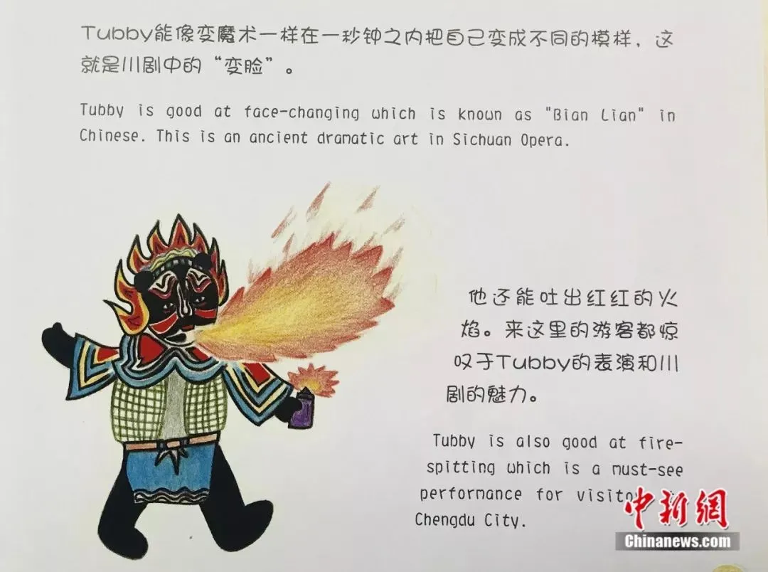在绘本中,主角Tubby是一只大熊猫,拿手绝活有川剧的变脸、喷火,还会长嘴壶茶艺。“将大熊猫作为绘本的主角,是因为大熊猫既能体现四川文化,还能和世界文化接轨,将成都形象传播到全世界。”