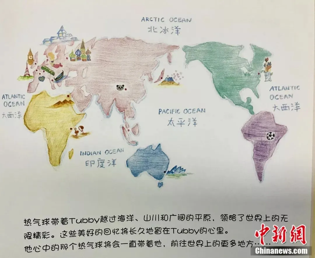 在《大熊猫Tubby游世界》的最后一页有一张地图,上面标注了大熊猫Tubby去过的国家,“世界那么大,Tubby还有很多地方没去。”
