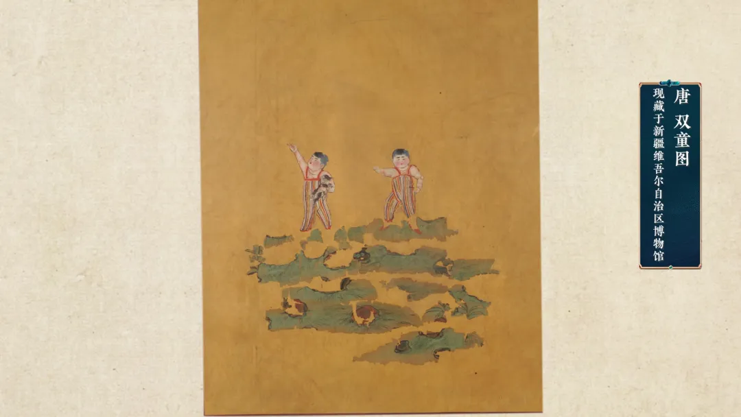 同一墓葬出土的绢画《双童图》上,描绘了两个穿着条纹背带裤的小男孩。显然,背带裤已经是唐朝儿童的潮款了。男孩手里抱着的宠物则是来自现在的乌兹别克斯坦的小狗,叫作康国猧子。这种小狗特别聪明,据说杨贵妃也养了一只。看来,古人养宠物与今天的人们并无二致。