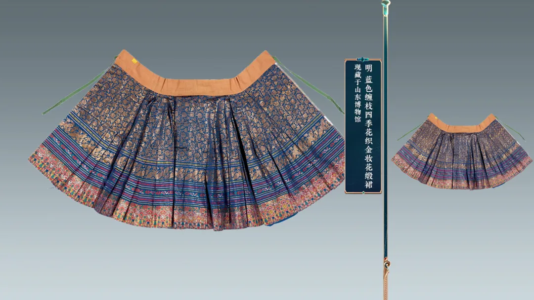 到了宋,质朴、高雅成了新的审美追求。宋人赵伯澐墓葬,为我们打开了一个南宋贵族的风雅衣橱。如今的潮品——马面裙,早在600年前的明代就已经风靡一时。这件蓝色织金妆花缎裙,被誉为明代传世马面裙代表作之一。为什么叫马面裙?缘由竟然和城墙有关。