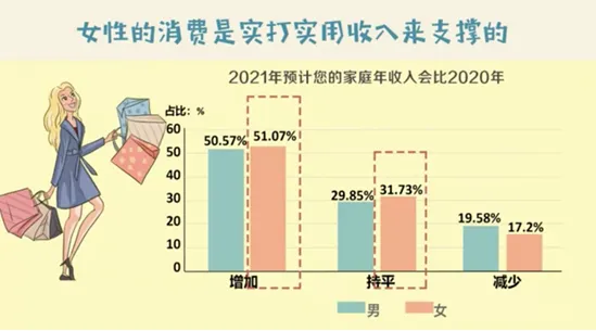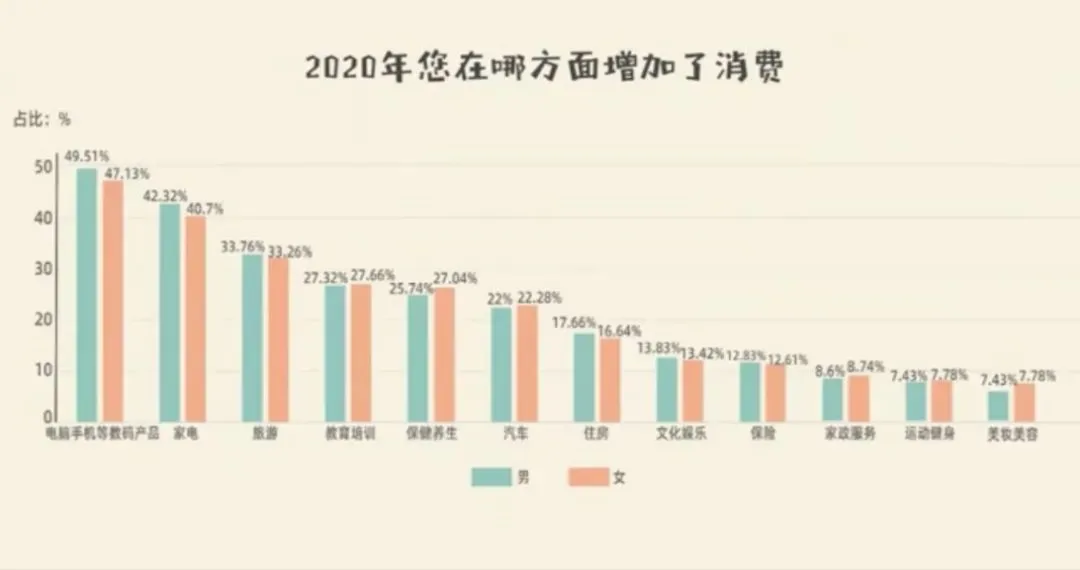 大调查发现,2020年,女性的购车消费达到22.28%,已经超过男性(22.00%)。别看不起这不到1%的超越,这是近十年来,女性的买车消费第一次超过男性,而且买车的女性更趋于年轻化,26-35岁的最多。“香车美女”,实力不容小觑。女人们消费的底气从哪来?大调查发现,预计今年收入跟去年持平和增加的女性数量都高于男性,女性的消费也是实打实用收入来支撑的。女性更愿意为什么买单,大调查发现,排在前三位的是旅游、保健养生和教育培训。相比之下,男女在购物清单上的整体差别并不大,在运动健身和美容美妆上女性高于男性,当问到为了健康愿意做哪些改变时,女性加强健身的比例也高于男性。中国的女人们都舍得在哪里花钱呢?大调查的榜单可以一目了然。