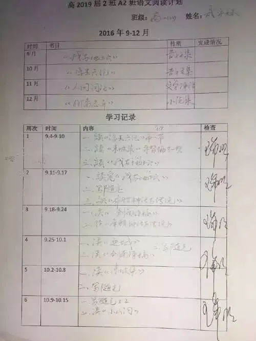 复旦附中高一的语文老师要求每个学生每星期都要记录自己的阅读情况。图为武亦姝两个月的阅读计划和实际阅读记录,从中可以清楚地看出她的兴趣所在。同时也看得出,该校对于学生阅读人文经典的重视。