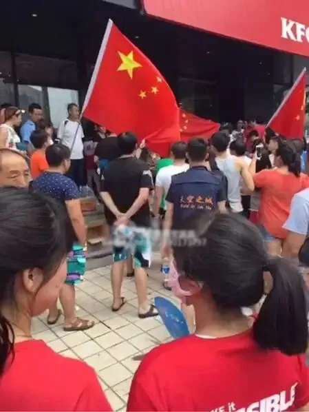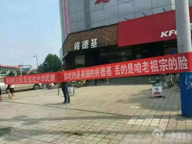 其实,“爱国”这个事本来没有错,但是现在,“爱国”似乎已经被一些人演绎出了五花八门的打开方式:前不久,所谓“南海仲裁”结果发布,微博和朋友圈里一度流传着“爱国诗”:然后就有一波人,决心用实际行动来证明自己的“爱国热情”。7月17日上午,河北乐亭县一家肯德基门口,有一群不明身份的民众打出横幅围堵了店门。横幅上写着:“抵制美日韩菲,爱我中华民族,你吃的是美国肯德基,丢的是老祖宗的脸。”