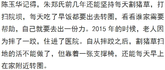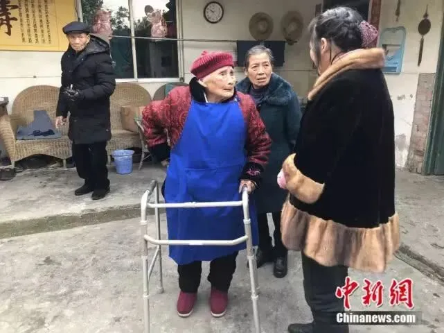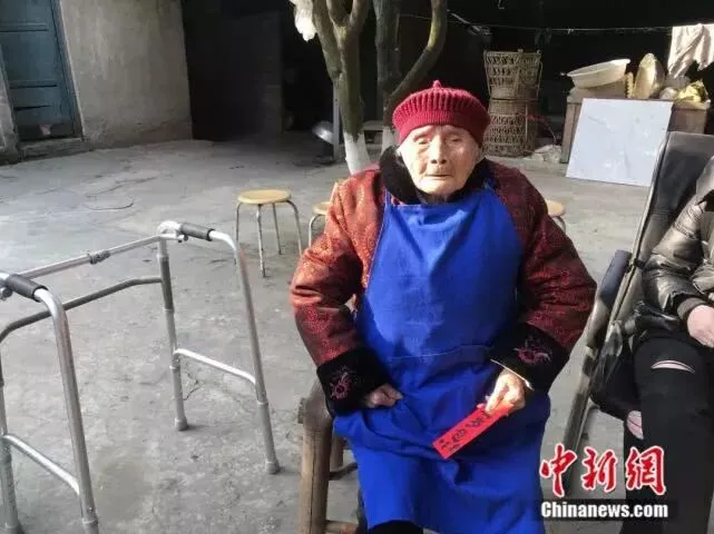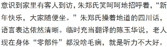 年逾百岁,现在除了腿脚不太便利,朱郑氏的生活基本能自理,拄拐能走路,吃饭能端碗,想要什么都能表达清楚。