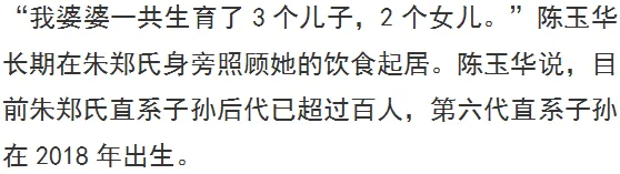 “我婆婆一共生育了3个儿子,2个女儿。”陈玉华长期在朱郑氏身旁照顾她的饮食起居。陈玉华说,目前朱郑氏直系子孙后代已超过百人,第六代直系子孙在2018年出生。