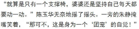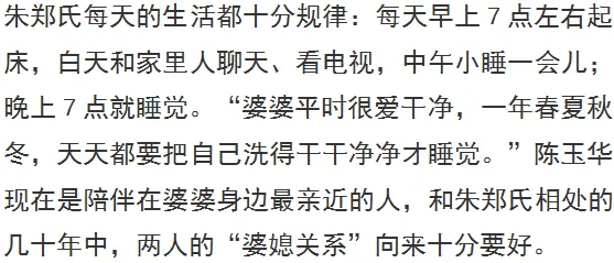 陈玉华说,朱郑氏一直以来心态都十分好,不挑食,对人也十分温和。唯一特别的地方就是:十分爱“动”,是一位妥妥的“闲不住老人”。