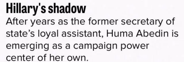 2000年,希拉里竞选美国参议员时,阿贝丁就成为了她最得力的竞选参谋。从那之后,两人一直形影不离,后来希拉里成为美国国务卿时,她也任命阿贝丁为自己的副幕僚长。现在,阿贝丁也是希拉里总统竞选团队的副主席,全程操持希拉里的行程、演讲内容以及如何和对手撕X等等......